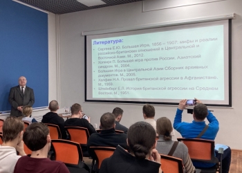 Кандидат исторических наук, доцент кафедры истории и права, почетный работник сферы образования Российской Федерации Владислав Владимирович Кузь прочитал лекцию «Алмаз за кровь»: начало Большой игры (конец XVIII – первая половина XIX вв.)»