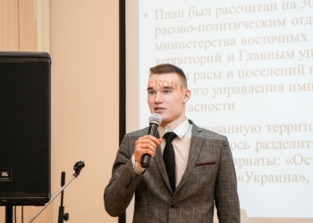 Лекцию «Оккупационная политика нацистской Германии и стран Оси на территории СССР в 1941-1944 гг.» прочитал Вячеслав Газизов, преподаватель Мурманского педагогического колледжа, лектор российского общества «Знание». Он рассказал о планах нацистской Германии и стран Оси в отношении захваченных территорий СССР, проведении оккупационной политики, дал сравнительную характеристику разных оккупационных режимов.